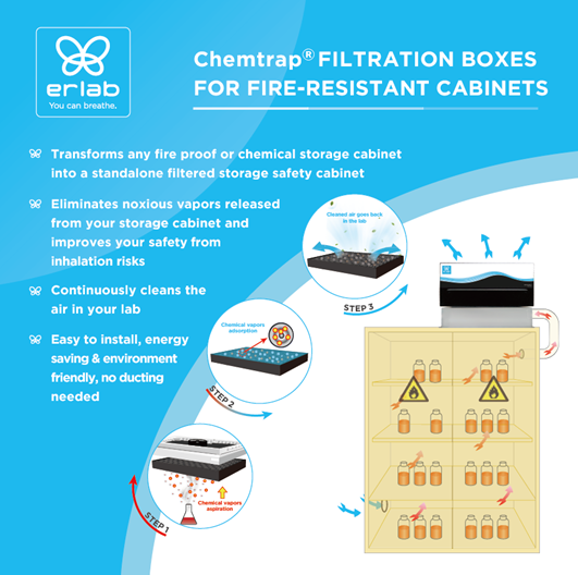 “Fireproofing constitutes the foundational layer; chemical filtration represents the essential secondary safety tier”. Erlab Chemtrap filtration system redefines chemical storage integrity, merging 50 years+ of filtration expertise with engineered precision to eliminate invisible inhalation threats. Erlab Chemtrap System bridges the gap between fire protection and vapor safety. Upgrade your storage cabinets today: visit Filtration boxes – Erlab or contact erlab-sales@erlab.net